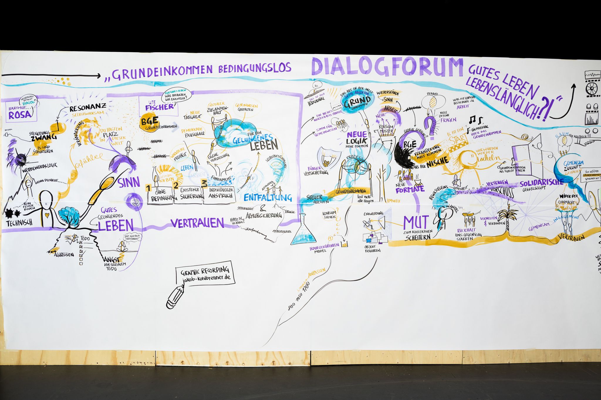 Am Vormittag führten das Koordinationsteam (siehe unten) sowie Prof. Hartmut Rosa und Prof. Ute Fischer lebendig in die Veranstaltung und das Thema ein. Nachmittags wurde sich entlang der Methode “World-Café” in wechselnden Kleingruppen über persönliche wie politische Fragen ausgetauscht: Was bedeutet Gutes Leben? Was würde sich mit einem Grundeinkommen ändern? Wie soll der Weg zu einem Grundeinkommen gestaltet werden? Abschließend wurde die Veranstaltung gemeinsam reflektiert.